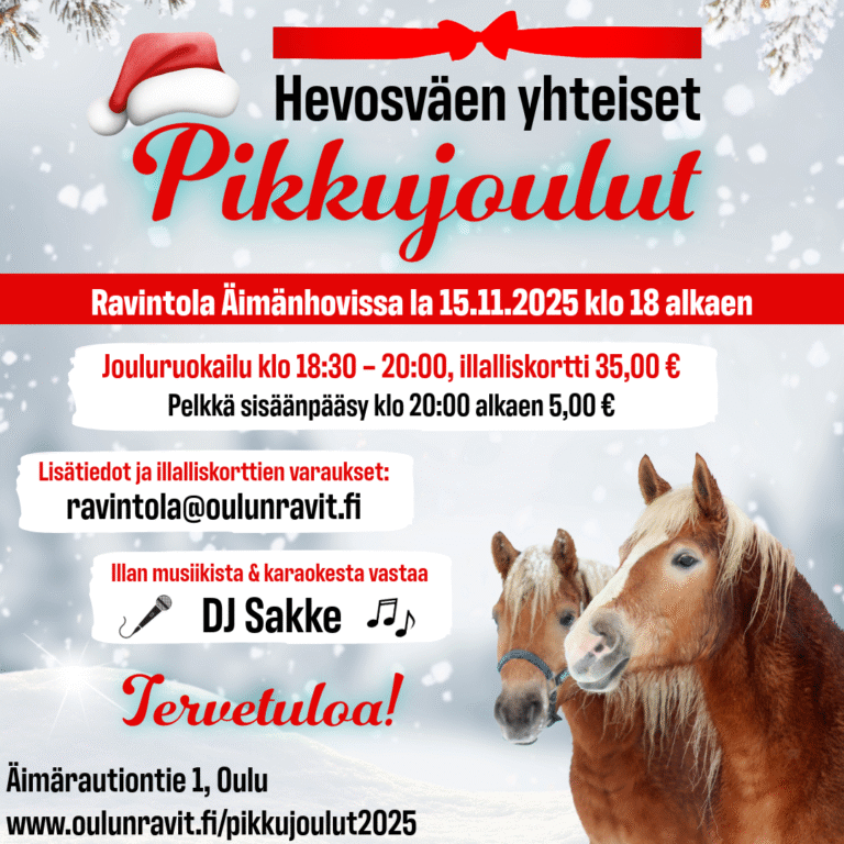 Kaikkien hevosmielisten yhteiset pikkujoulut vietetään Äimärautiolla lauantaina 15.11. kello 18 alkaen. Pikkujoulut järjestetään ravintola Äimänhovissa.
