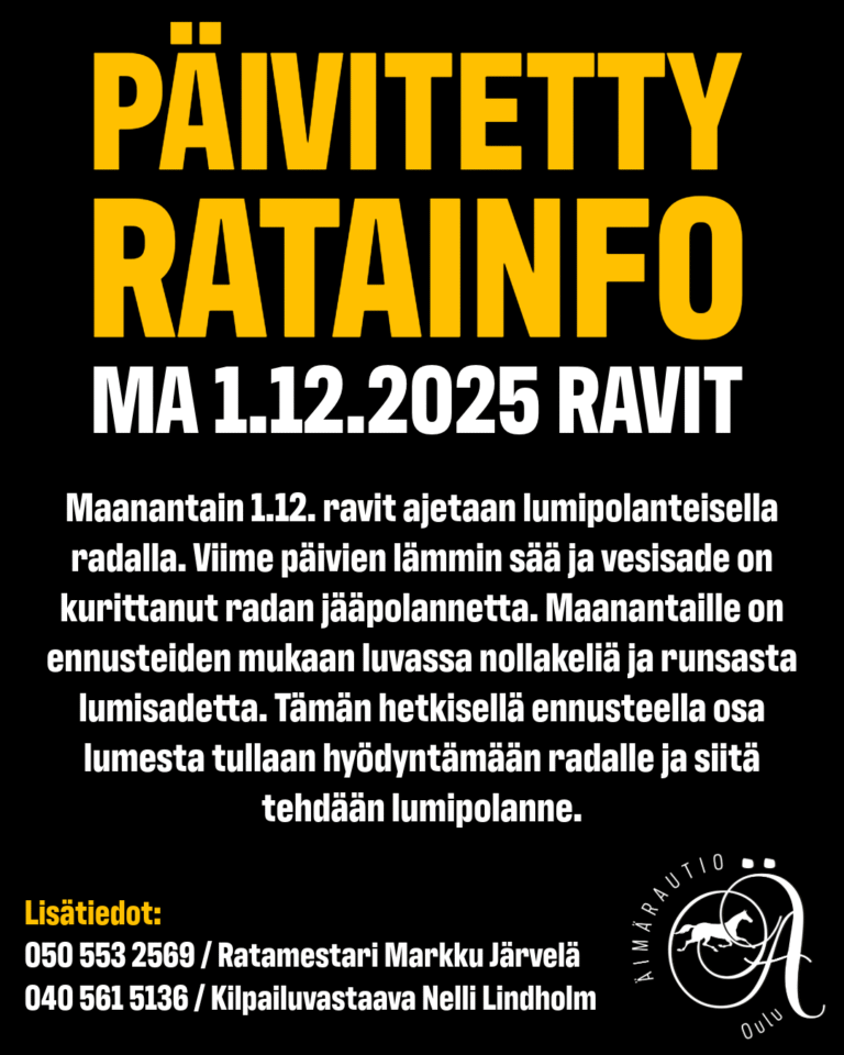 Oulussa ravataan tänään klo 18:30 alkaen. Kavioura on hiekkapintainen. Iltapäiväksi on luvattu pientä lumisadetta ja varikolla voi olla jäisiä kohtia. Hokkikenkä on suotava. Tutustukaa illan lähtöaikatauluun Heppa-järjestelmästä.