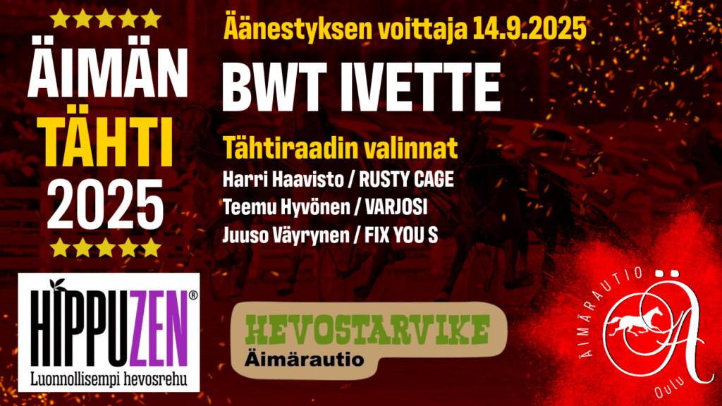Äimärautiolla ravattiin sunnuntaina peräti yksitoista totolähtöä ja kolme ponilähtöä. Oulun Kuninkuusraveissa kuningatarkilpailussa hienosti viidenneksi sijoittunut Varjosi palasi radoille voittovireessä. Niko Jokelan ajokin tehtävästä ei muodostunut helppo, sillä Sjö Jenta tarjosi suoraviivaisella keulataktiikalla kovan vastuksen. Jokela oli päivän kaksoisvoittaja, toisen voiton toi BWT Ivette. Päivän muut voittajat olivat Laina, Galliard Step, tappiottomana jatkava Villitsee, Rusty Cage, Meno-Antti, Boulder Titan, Fix You S, Roy Orden ja Harlamov. Ponilähdöistä kaksi meni Daalia Koivupalon ja Emilia Pätsin nimiin, kun Golden Cristian ja Matheo voittivat omat lähtönsä. Kolmas ponivoittaja oli Jokimäen Sakke.
