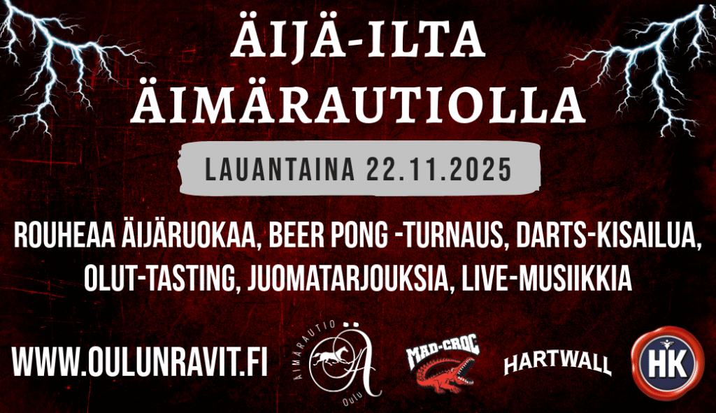 Äimärautiolla vietetään lauantaina 22. marraskuuta rouheaa ja konstailematonta Äijä-iltaa. Ohjelmassa on buffet-ruokailua, kisailua, olut-tasting ja livemusiikkia – kaikki samassa paketissa! Ovet aukeaa kello 18:00 ja ruokailu alkaa kello 18:30.