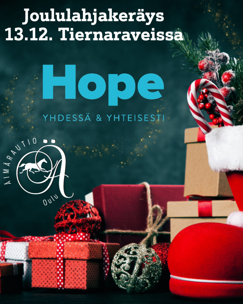 Keräämme lauantain 13.12. Tiernaraveissa jouluapua vähävaraisille perheille, yhteistyössä Hope – Yhdessä & Yhteisesti Oulu. Voit tuoda lahjoituksena uusia lahjoja, huoneenlämmössä hyvin säilyviä elintarvikkeita, hygieniatuotteita sekä ruokaa perheiden lemmikeille. Keräyspiste sijaitsee katsomossa infopisteen läheisyydessä.