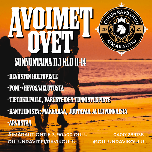Oulun Ravikoululla on avoimet ovet sunnuntaina 11.1. kello 11-14. Tapahtumassa hevosten hoitopiste, poni-/hevosajelutusta, tietokilpailu, varusteiden tunnistuspiste sekä arvontaa. Lisäksi kanttiinista makkaraa, juotavaa ja leivonnaisia.