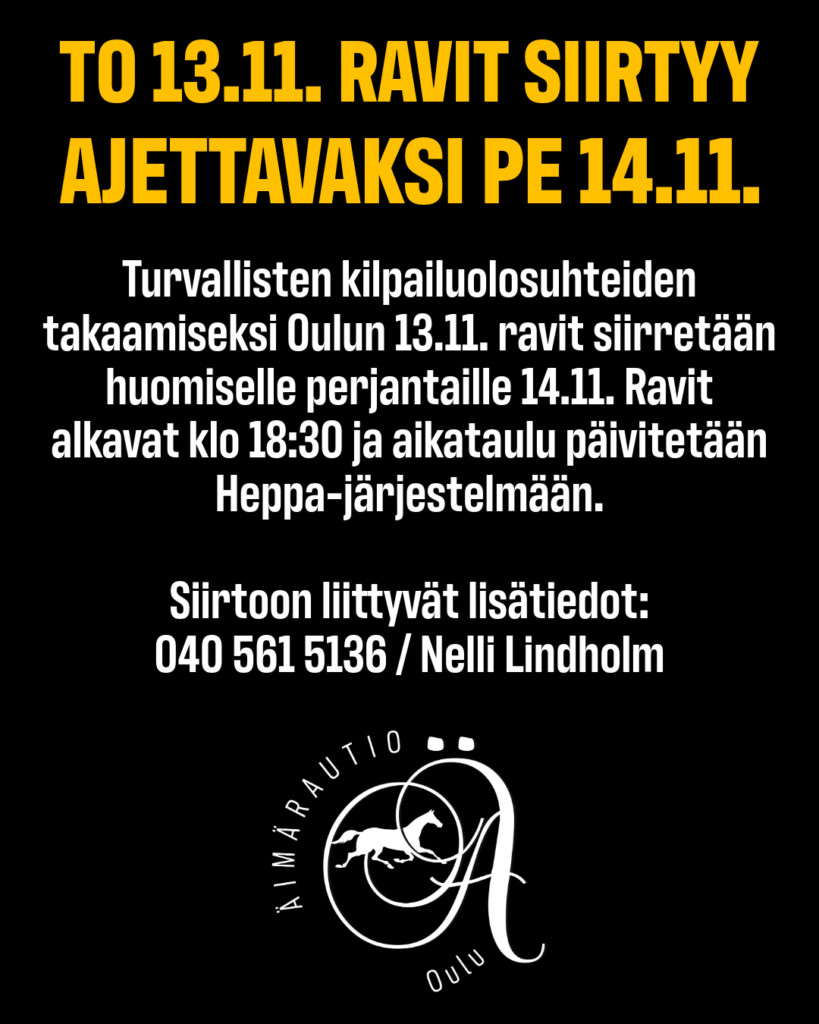 Turvallisten kilpailuolosuhteiden takaamiseksi Oulun 13.11. ravit siirretään huomiselle perjantaille 14.11. Ravit alkavat klo 18:30 ja aikataulu päivitetään Heppa-järjestelmään.