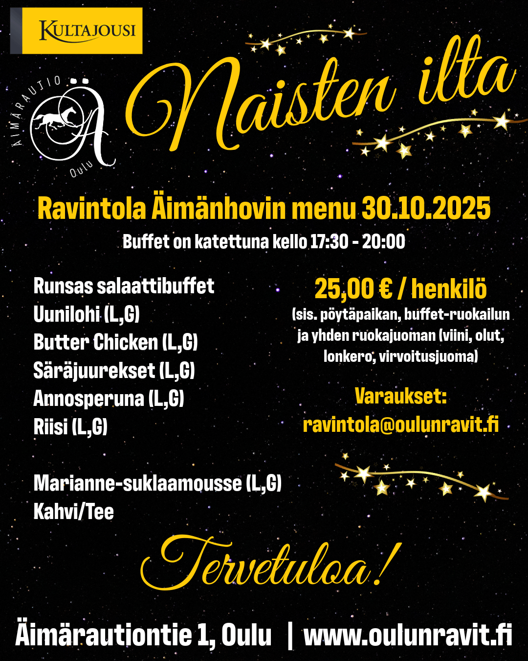 Äimärautiolla ei tarvitse seurata raveja nälkäisenä, siitä pitävät huolen raviradan monipuoliset ravintola- ja kahvilapalvelut! Ravintola Äimänhovissa pääset nauttimaan huippuraviurheilusta aitiopaikalta, herkullisen buffetin antimista nauttien. Varaa paikkasi ensisijaisesti sähköpostitse osoitteesta ravintola@oulunravit.fi. Puhelimitse voit olla yhteydessä numeroon 0400-137336.